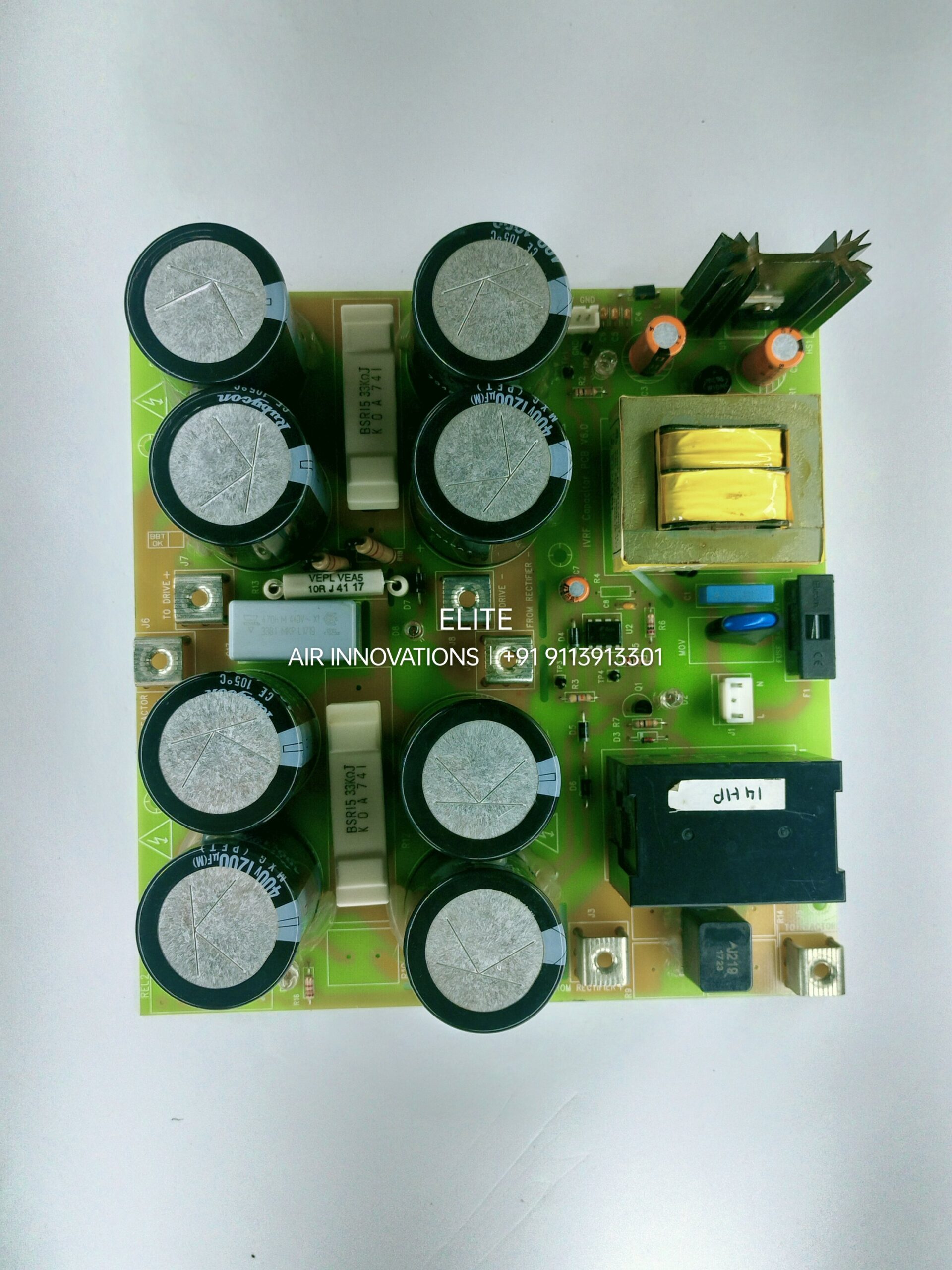 this PCB high-power Inverter Power Board, likely from a larger capacity air conditioning unit (the “14 HP” a high-horsepower commercial or VRF system). This board specifically handles the rectification and filtering of power before it is sent to the compressor.